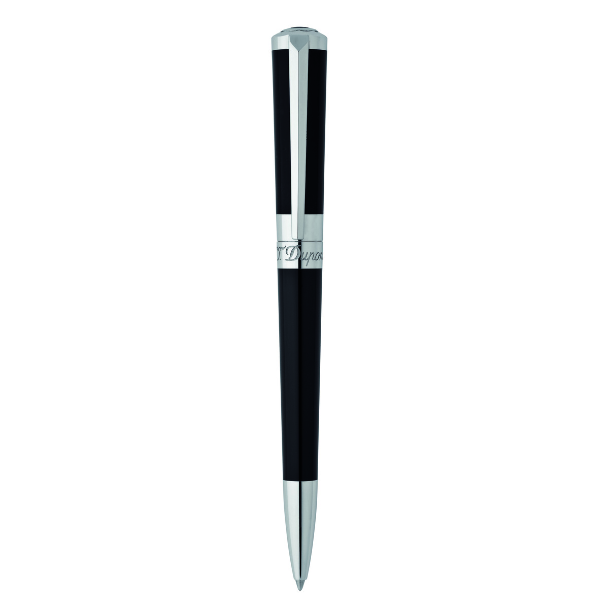 Stylo à mécanisme à rotation. Une ligne d'écriture totalement dédiée aux femmes, une ligne résolument moderne et élégante. Le haut du capuchon, parfaitement facetté tel un diamant taillé en brillant, porte le sceau de la marque, le "D". L'encliquetage du capuchon résonne malicieusement comme l'écho au cling inimitable du briquet S.T. Dupont. Finitions Palladium
