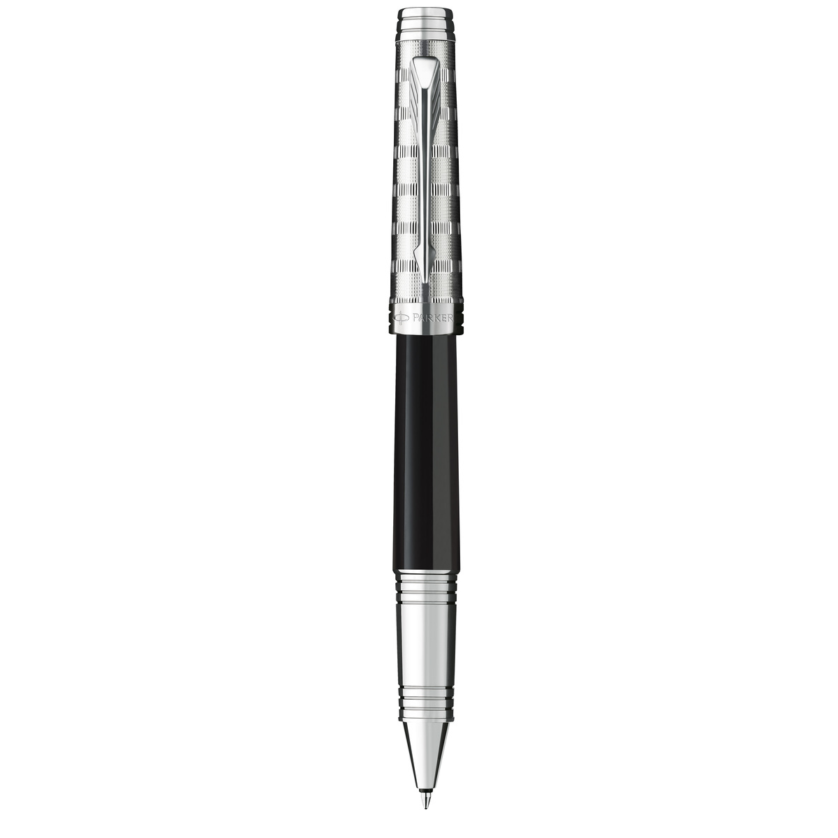 Rollerball. Laque noire et capuchon motif tartan écossais ciselé en plaqué argent. Livré dans son écrin luxe et avec sa garantie Parker.